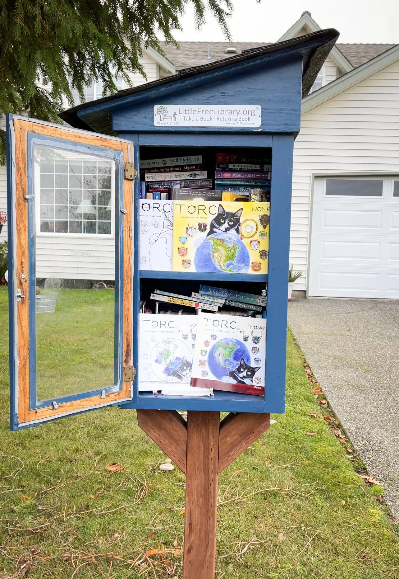 TORC visited a total of 21 Little Free Libraries in Anacortes, Washington State, where he donated 58 books. The first-time finders got a coloring book as a bonus to the matching TORC the CAT children's books.